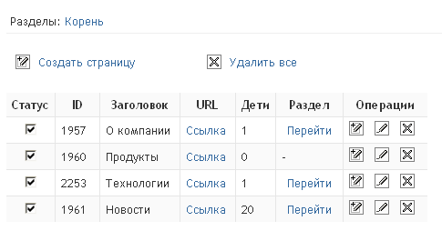 Чтобы перейти на уровень ниже - нужно в столбце "раздел" щелкнуть "перейти" напротив нужной страницы.